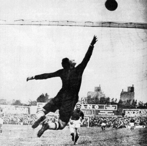 Silvio Piola of Italy with an effort saved by Hungarian goalkeeper Szabo in the final.