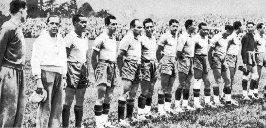 Brazil's team lined up before the Poland match. From left ro right: masseur, coach Pimenta, Leonidas, Zeze Procopio, Romeu, Machado, Hercules, Peracio, Lopez, Alfonsinho, Domingos da Guia, Batatais, Martim Silveira.