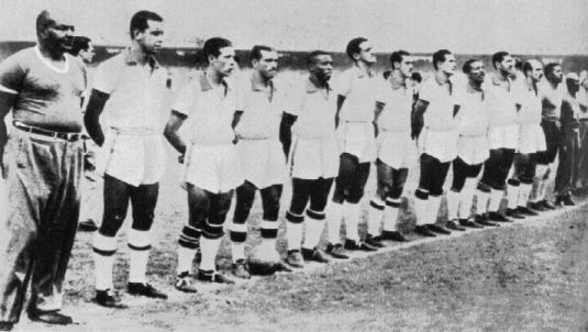 Brazil's team in the final. From left to right: Johnson (masseur), Bauer, Chico, Jair, Bigode, Danilo, Ademir, Friaca, Zizinho, Juvenal, Augusto and Barbosa.