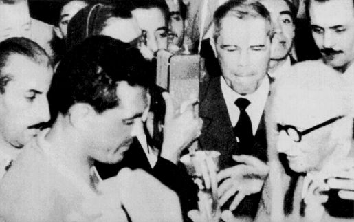 A proud moment for Uruguay's captain Obdulio Varela as he receives the World Cup trophy, the Jules Rimet Cup, from the man himself, Jules Rimet.