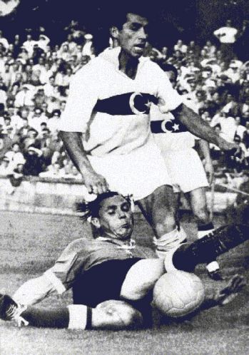 Action from West Germany's 7-2 win over Turkey. German striker Max Morlock who scored 6 goals in this World Cup, shows he can tackle as well as scoring.