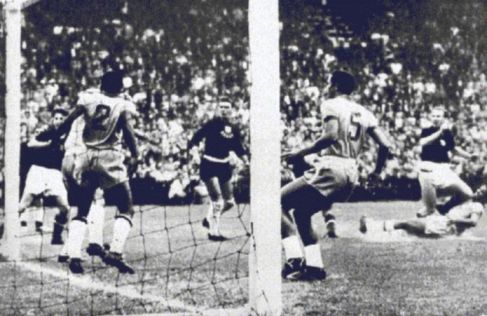 From the quarterfinal between Hungary and Brazil. Hidegkuti (dark shirt far right) puts Hungary 1-0 up after only seven minutes.