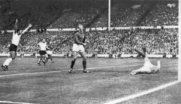 West Germany take an early lead after a goal by Helmut Haller (not in the pic). English defender Jackie Charlton in the center.