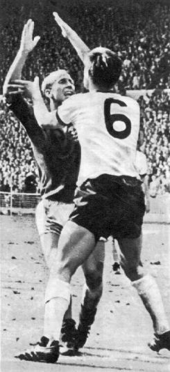 Bobby Charlton and Wolfgang Weber (6) in a dispute over a decision by the referee.