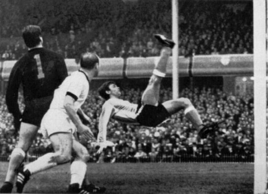 South American acrobatics in a boring 0-0 draw. Argentina's Perfumo clears in defence as West German captain Seeler watches.