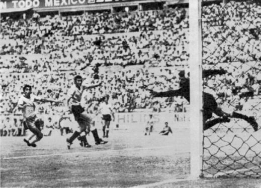 From the semifinal between Brazil and Uruguay. Clodoaldo (far left) makes it 1-1 right on half time with a great shot.