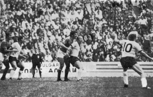 From the action-packed semifinal thriller between Italy and West Germany. Typical Italian man-marking school. Rosato takes care of topscorer Müller (left) and Bertini watches captain Seeler (center).