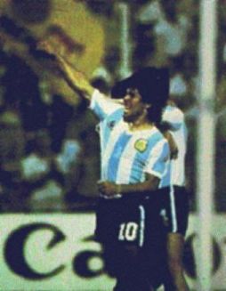 Diego Maradona during the game against Hungary greeting the crowd after one of his two goals in the 4-1 win. Argentina were back on track after the defeat to Belgium in the opening game.