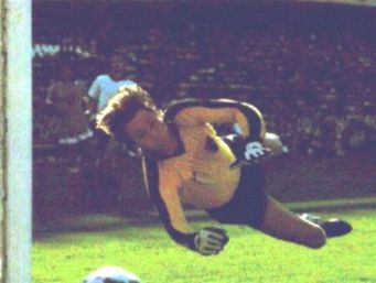 Austrian goalkeeper Friedel Koncilia in action against France in the second phase, here controlling a French effort which missed the target. But he was beaten once by a marvellous Genghini free-kick which turned out to be the only goal of the game.