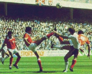 Trevor Francis of England (white shirt) has troubles getting the ball from Kuwaiti defenders, but he turned out to be the only goalscorer of the game which meant England kept their 100% record of three wins in the first round.