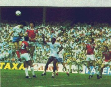 Aerial battle in the first round game between England and France in Bilbao. Paul Mariner and Didier Six rise to meet the cross watched by Sansom, Thompson and Butcher for England and Tresor for France. England won the game 3-1.