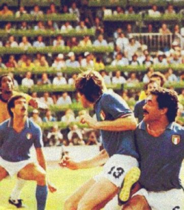 Crowded Italian penalty-area as Brazil push forward for more goals. Players nearest are from left to right: Serginho, Bergomi, Oriali and Gentile.
