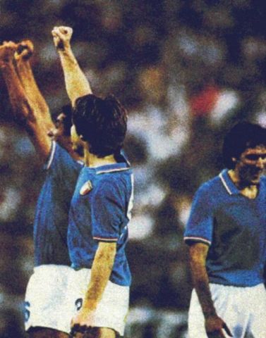 Italian players from left to right: Claudio Gentile, Gabriele Oriali and Gaetano Scirea waving to the crowd after Altobelli's goal. Italy are 3-0 up in the final against West Germany and there are only minutes to go.