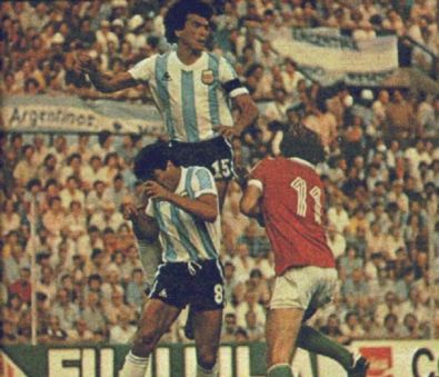 Argentina captain Daniel Passarella showing strength in the air in the match against Hungary which Argentina won 4-1. The other players are Galvan (8) and Poloskei (11).