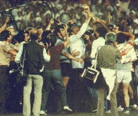 The celebrations can start. Italy are World Cup winners and coach Enzo Bearzot lifts the trophy on a lap of honour surrounded by photographers. Behind him is Dino Zoff, at 40 he is the oldest ever winner of the cup.