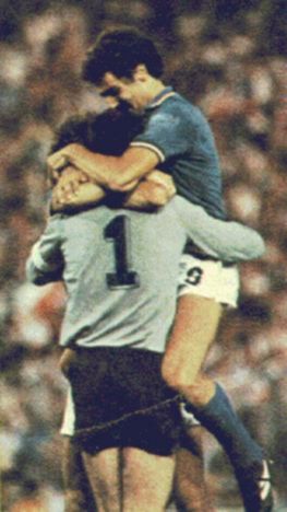 The final is over. Italy have beaten West Germany 3-1. Eighteen year old Giuseppe Bergomi hugs his 22 year older captain Dino Zoff. The celebrations can start.