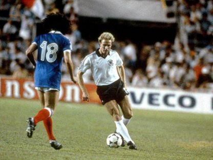 in the dramatic semifinal against France. Dominique Rocheteau is challenging