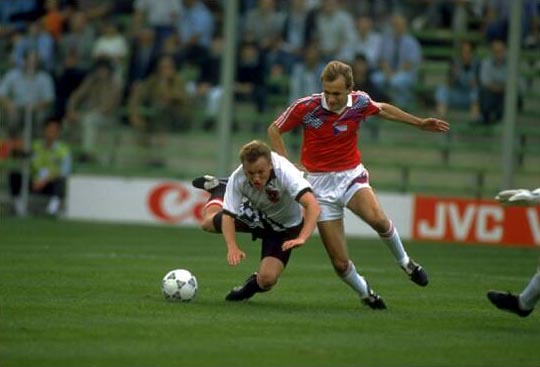 Austria's Gerhard Rodax is sent crashing to the ground by Czechoslovakia's Vladimir Weiss.