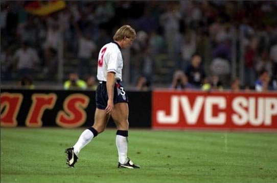 A long walk back to the center circle for Stuart Pearce who has just missed his penalty in the shoot-out.