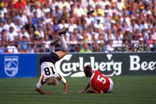 Jürgen Klinsmann flies high after being tackled by Jan Kocian of Czechoslovakia in the quarterfinal. West Germany won the game 1-0 after a Matthäus penalty was converted.