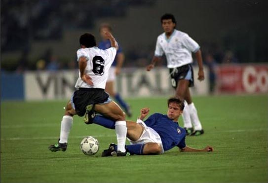 Italy's Nicola Berti with a dangerous tackle against Alfonso Dominguez of Uruguay.