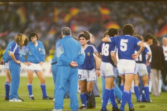 The final is over. German flags are waving in the background. In the Argentina camp there is only despair. Maradona in the center of the picture.