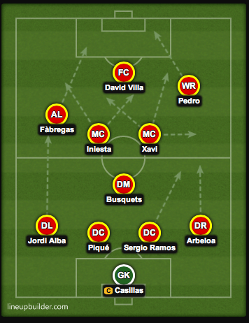 and Iniesta recreate the Barça fantastic midfielder duo in the Spanish team. Villa can be used as centre forward, modifying thus the